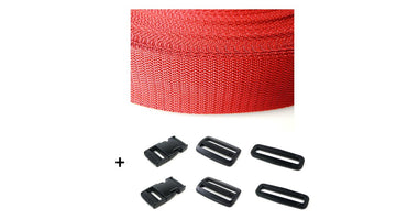 Complete set band rood en gespen 50 mm 10 meter. Deze complete set is ideaal als je wilt dat de gespen goed aansluiten op de spanband. Je hoeft dan niet te zoeken naar de ideale gespen, die krijg je er gewoon bij. De complete set bestaat uit 6 gespen en één spanband die ideaal op elkaar aansluiten. Dit komt doordat we rekening hebben gehouden met het formaat van de spanband: 50 millimeter breed, 16 millimeter dik en 10 meter lang.
